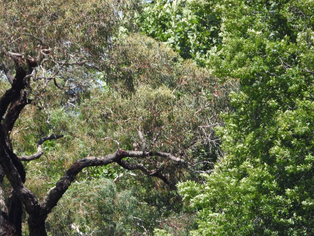 Girri was flying from one of the dead roost trees at noon today to some trees near some abandoned cottages and I was lucky enough to get a quick clip of her in flight. My companion, Helen, is a volunteer who helps out with the plant propagation, which we had just finished.